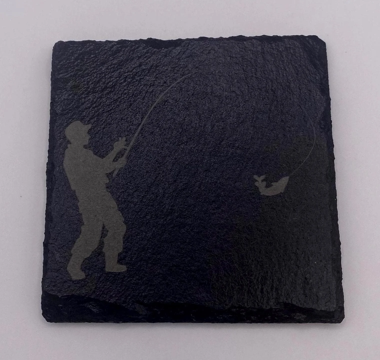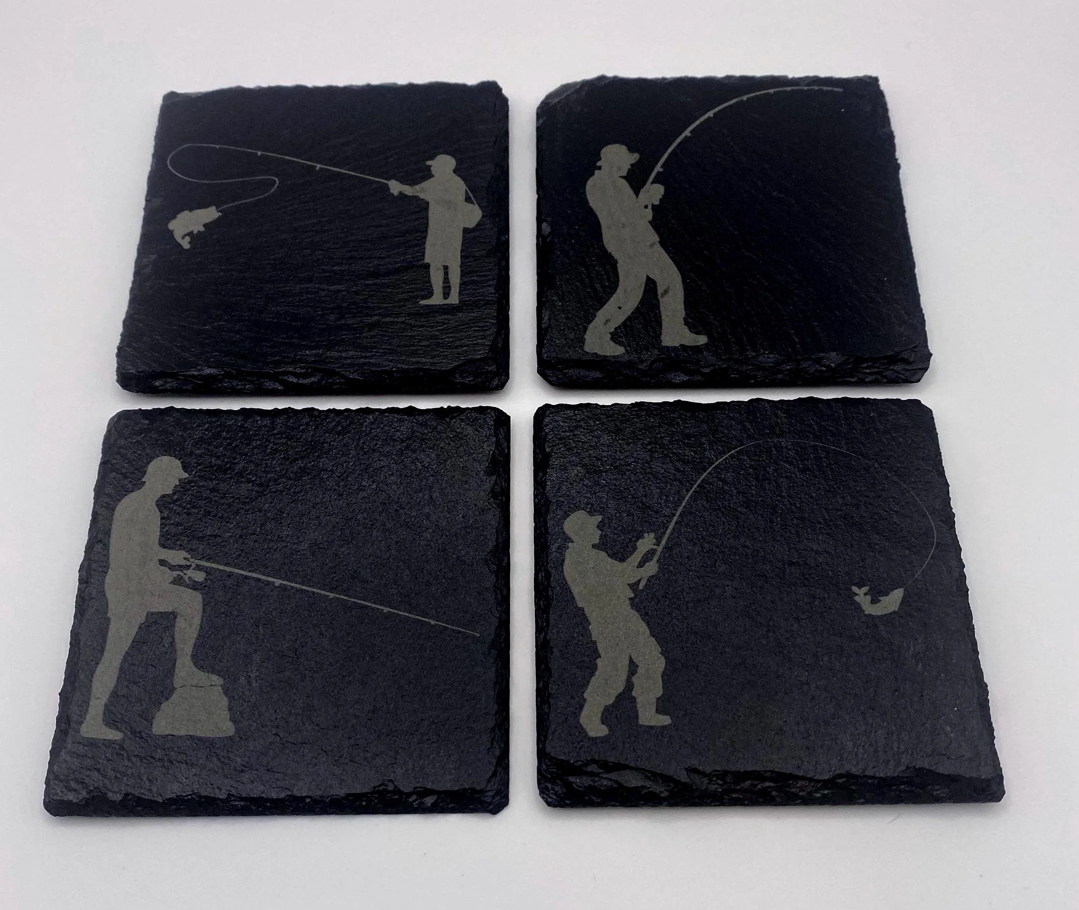 Bring the great outdoors into your home with this set of four beautifully engraved slate coasters, each featuring a unique fishing scene.